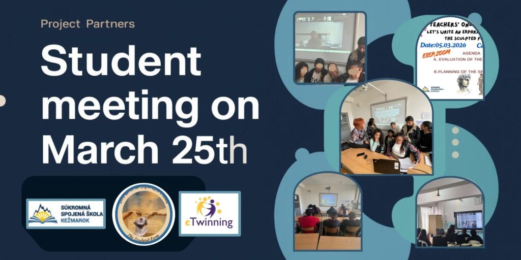 Dňa 25. marca sme sa zúčastnili online stretnutia s našimi projektovými partnermi v rámci projektu Let’s Write an Ekphrastic Poem 2: The Sculpted Form. Keďže sa projekt blíži ku svojmu záveru, projektové tímy sa podelili o svoje skúsenosti z jeho realizácie. Žiaci mali príležitosť prezentovať zručnosti, ktoré nadobudli počas jednotlivých aktivít, a diskutovali o tom, ktoré úlohy boli pre nich najnáročnejšie, ako aj o tých, ktoré najviac prispeli k rozšíreniu ich vedomostí. Stretnutie bolo prínosné, podporilo vzájomnú komunikáciu, spoluprácu a motivovalo žiakov k ďalšej tvorivej práci v projekte.